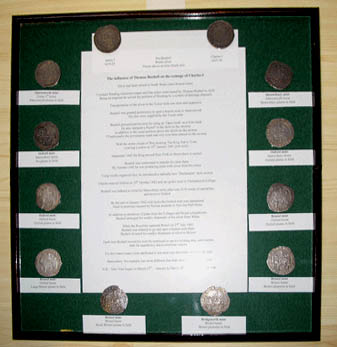 By the 1600's the silver mines of Wales were mostly unworkable due to flooding. Mr Bushell invested heavily and managed to drain the mines to retrieve more silver. After many pleas to the crown Bushell was allowed to open a mint at Aberystwyth, thus saving on the high transport costs of hauling the silver to and from the Tower. Two conditions were imposed, namely he finance the whole operation and the dies be supplied from the tower. However, as the Civil War progressed Charles lost control of the Tower and was forced to establish mints elsewhere. As the fortunes of King Charles waned so he was forced to move his hastily established mints from stronghold to stronghold. Also as dies were no longer available from the tower, and being expensive to produce, there was little choice but to reuse old dies whenever possible. Thus as a mint closed, so the dies were dispatched to the new location, and either repaired or modified so that they could be used again. Maurice's display consisted of examples of halfcrowns produced from these roving dies, starting at Aberystwyth to Shrewsbury to Oxford to Bristol and finally to Bridgenorth, each example showing the salient distinguishing features.